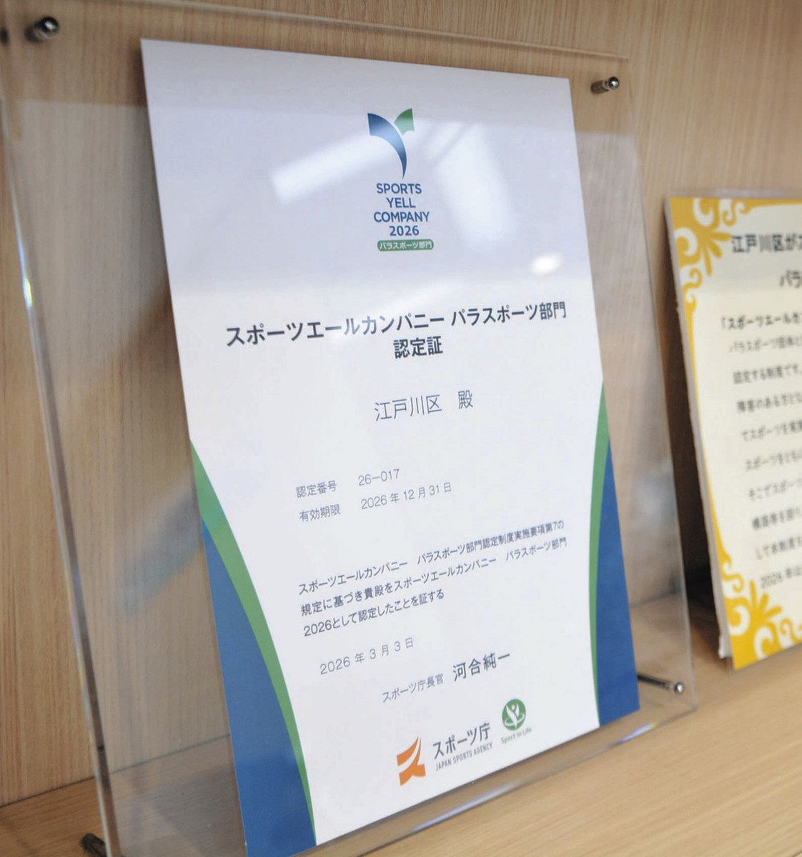 パラスポーツの普及や推進のために関係団体と連携している自治体や企業に贈られる、スポーツ庁の認定制度「スポーツエールカンパニー パラスポ...