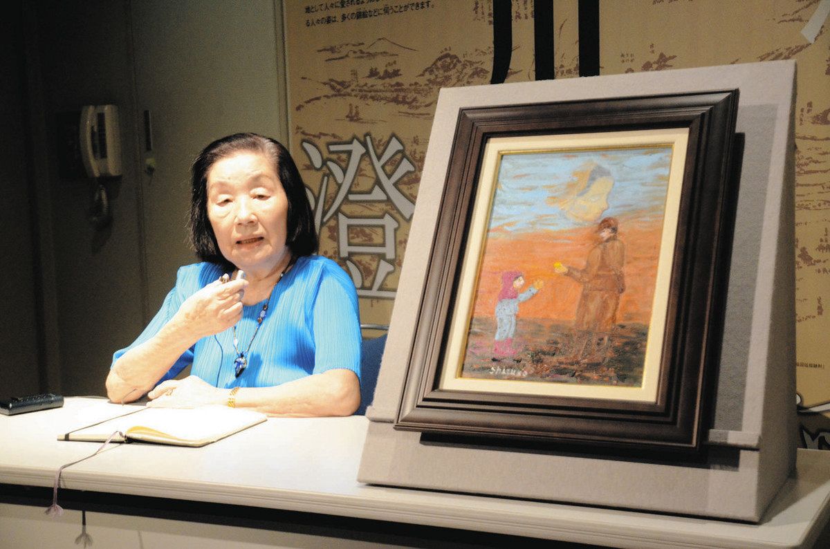 西尾さんの体験画は、自宅の焼け跡で父と再会した時の心象画。空襲で行方不明になった従姉(いとこ)の顔が空に描かれている。西尾さんは空襲犠牲者の遺骨が安置されている都慰霊堂に従姉の遺骨も「きっと入れられている」と信じ「(空襲があった)3月10日には慰霊堂にお参りに行っている」と話した。(酒井健)