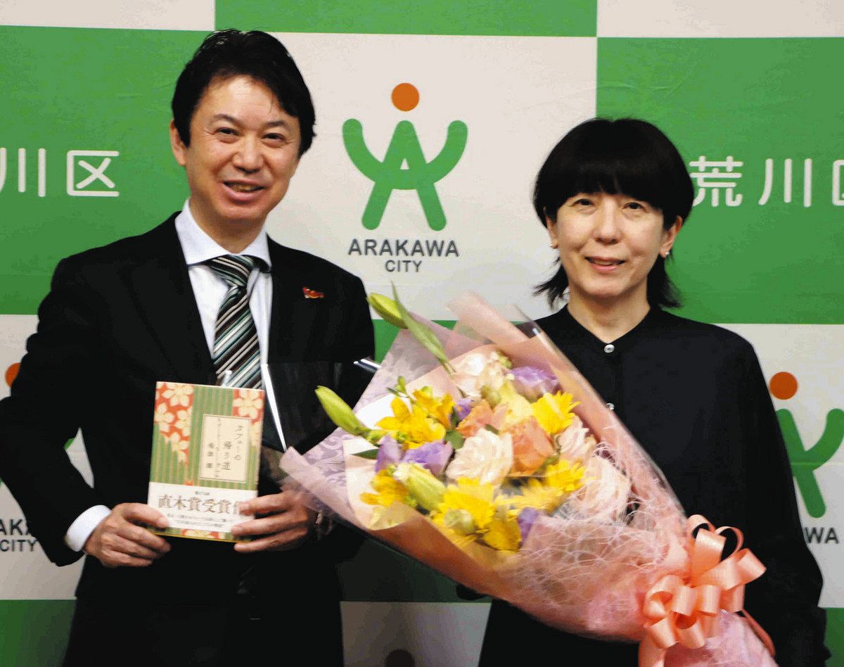 花束を手にする嶋津輝さん(右)と、受賞作「カフェーの帰り道」を持つ滝口学荒川区長=荒川区で