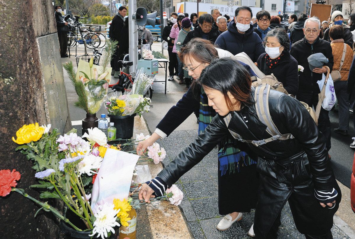 東京大空襲犠牲者の追悼碑に献花する参列者たち=台東区で