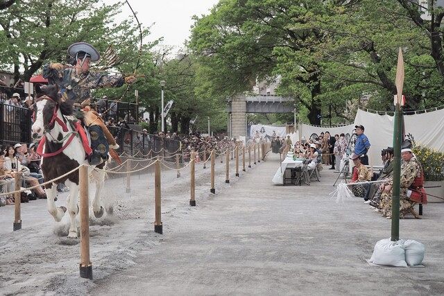 会場となる隅田公園には白砂を敷いた幅約2m・長さ約300mの特設馬場(すみだリバーウォーク〜言問橋間)が設けられ、鎌倉武士の狩装束に身を包んだ射手が、疾走する馬上から壱ノ的・弐ノ的・参ノ的を次々と射抜きます。静まり返った瞬間に響く掛け声と、人馬一体で駆け抜ける迫力は圧巻。的中の瞬間、紙吹雪が舞う演出も見どころで、春の浅草に凛とした空気を運びます。3つの的すべてに命中した射手には表彰が行われるので、観覧席の緊張感もいっそう高まります。