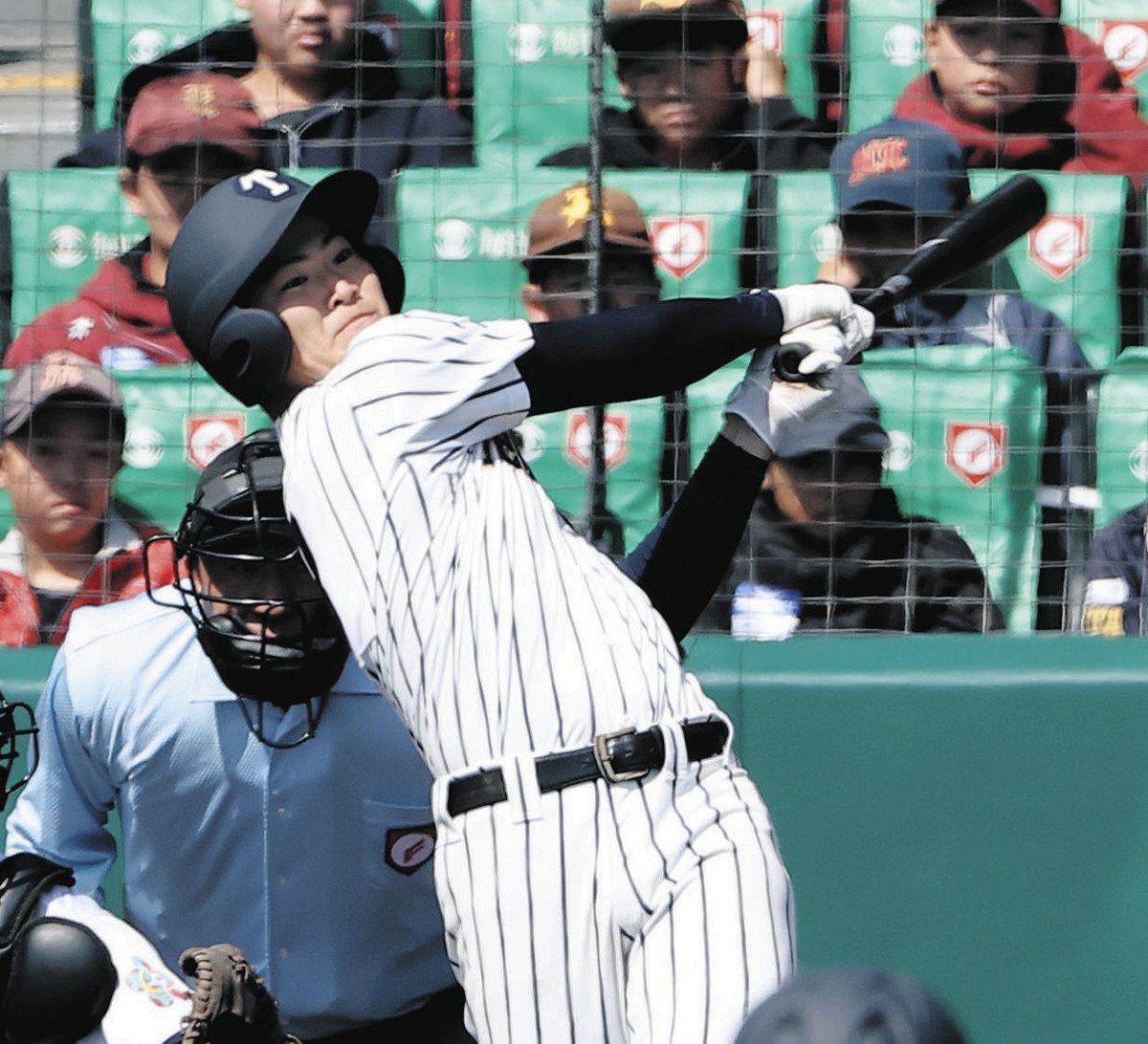 五回、2点二塁打を放つ目代龍之介選手=甲子園球場で