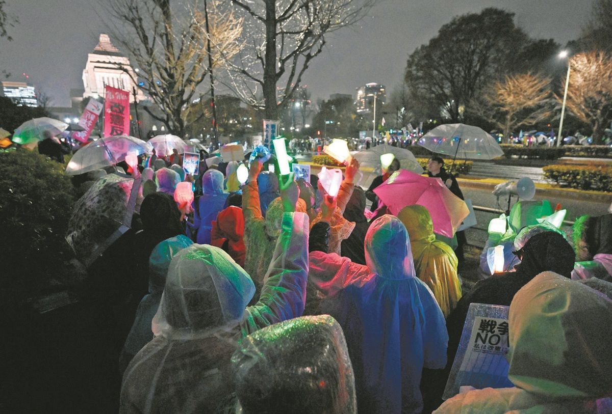 高市政権が目指す改憲に歯止めをかける「平和憲法を守るための緊急アクション」が25日夜、国会前であり、若い世代を中心に大勢が音楽に合わせてペンライトを振り、「武力で平和はつくれない」「戦争反対9条守れ」などとコールを繰り返した。