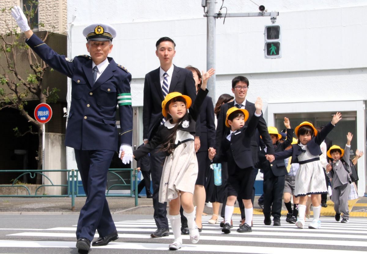 筒井洋樹警視総監が新入生に横断歩道の渡り方を指導 大田区立大森第一小学校