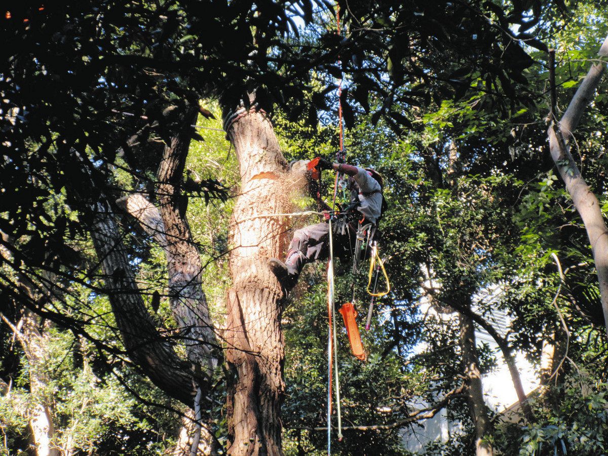 命綱をつけて木に登り伐採作業をする作業員(区提供)