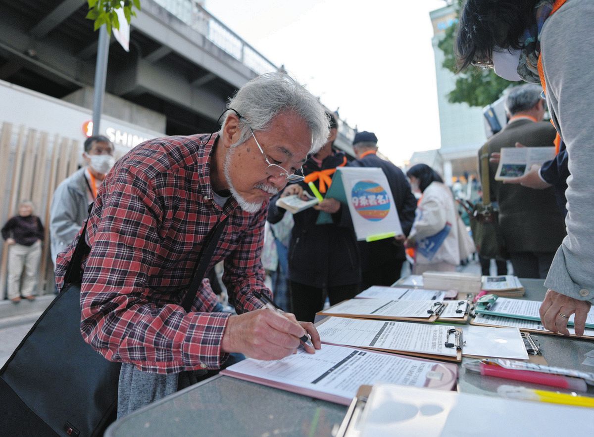 憲法9条の改憲に反対する署名をする人ら=東京都新宿区で(木戸佑撮影)
