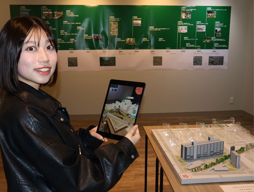 平+に展示された団地の模型にタブレットをかざして、ARを表示する大東文化大の諏訪光羽さん