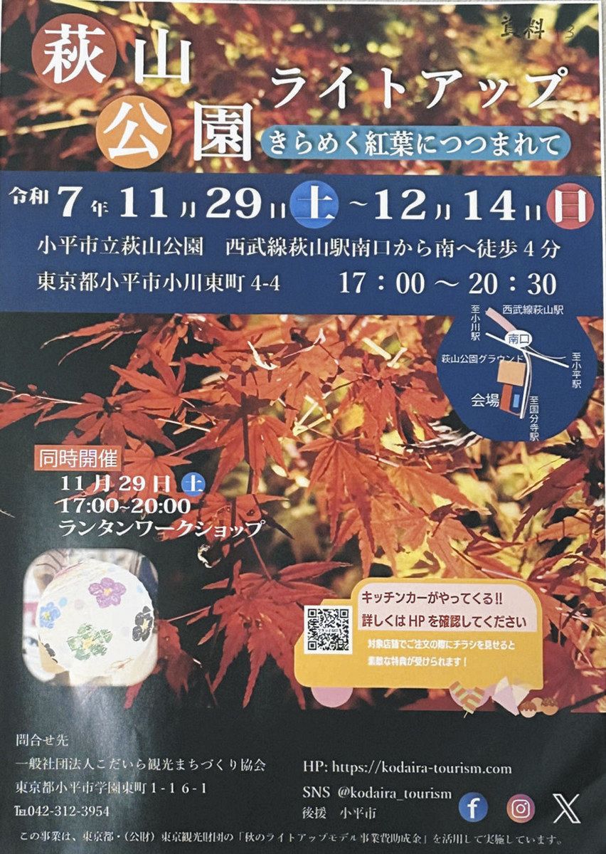 東京都小平市萩山公園で29日から、園内の100本超のイロハモミジを照らすライトアップが始まる。12月14日までの午後5~8時半、幻想的な空間で色鮮やかな紅葉を楽しむことができる。