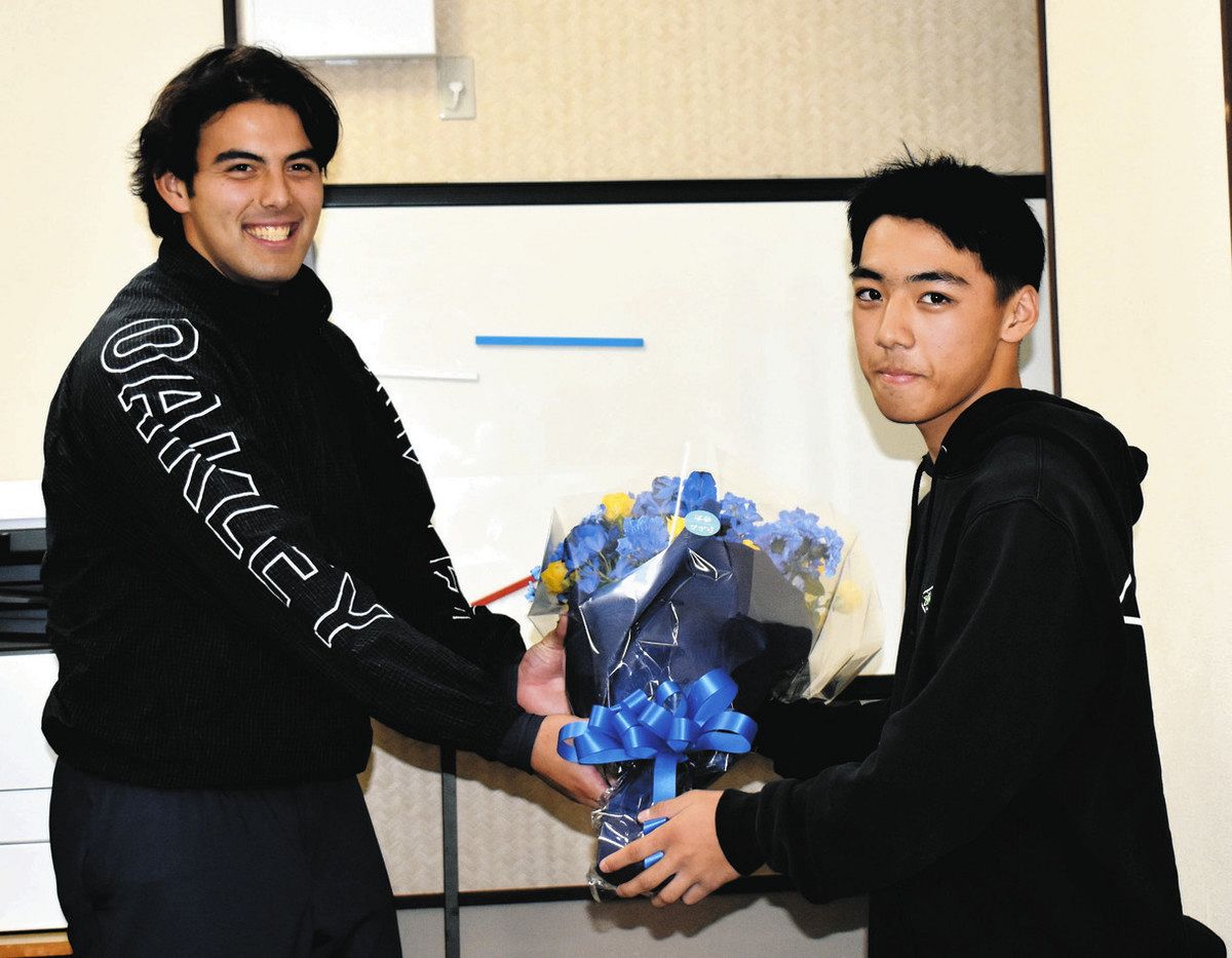 中学現役部員から花束を受け取るマシュー投手(左)