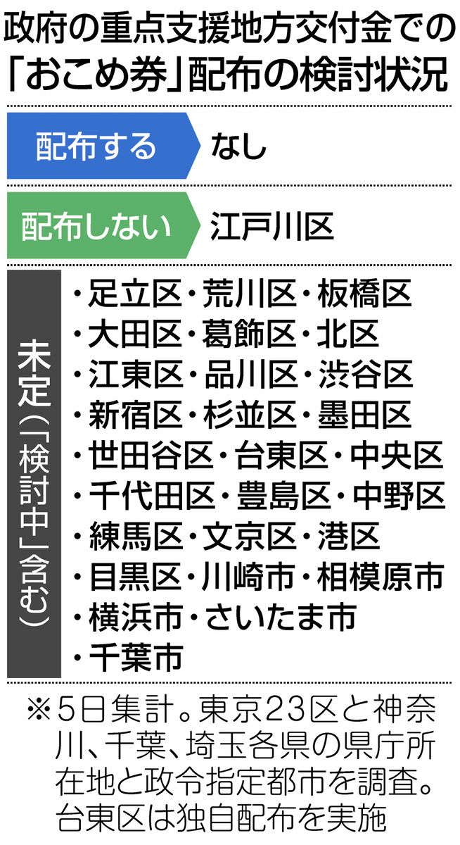 4、5の両日、東京23区と首都圏3県の県庁所在地、政令指定都市の担当者に電話などで聞き、5日時点の取材結果を集計した。コメなどの購入に充てられるおこめ券を、交付金を使い配布すると明言した自治体はゼロ。「国の補正予算案の成立が分からない状況で、申し上げることはできない」(練馬区)などとして、27自治体はおこめ券を配るかどうかを含めて「検討中」「未定」だった。江戸川区は配布しない方針だ。