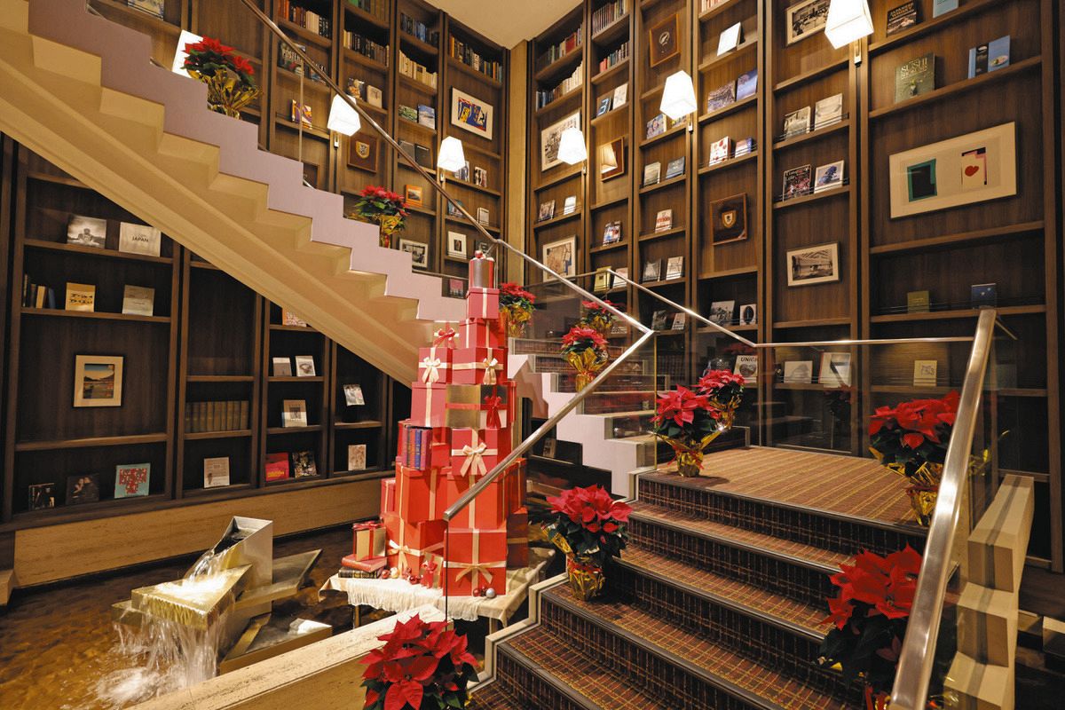 星やリボンで飾り付けされたクリスマスツリーが美しい。この時季らしい、赤、白、緑のきらびやかな光景に心が華やぐが、よく見ると、何かが違う。そう。これは本を積み上げて作ったもの。芝パークホテル名物の「ブックツリー」である。