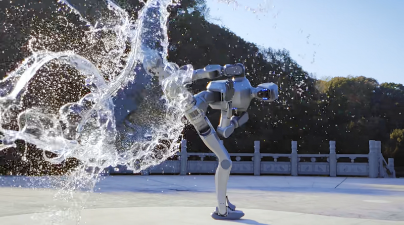DR02は、スクワットからの立ち上がりや横方向へのハイキックなど、大幅な動的動作を素早く行う際も、その姿勢は依然として堅実です。テストにおいては、突然の水かけ干渉に直面しても、その動作チェーンが中断したり足元がふらついたりすることはなく、強力な抗干渉能力を示しました。この迅速な応答と回復能力は、多関節、特に腰部の即時補償によるものです。動作完了の瞬間、システムは関節間の阿吽の呼吸を通じて残存する揺れを迅速に解消し、安定した準備状態へと回帰します。