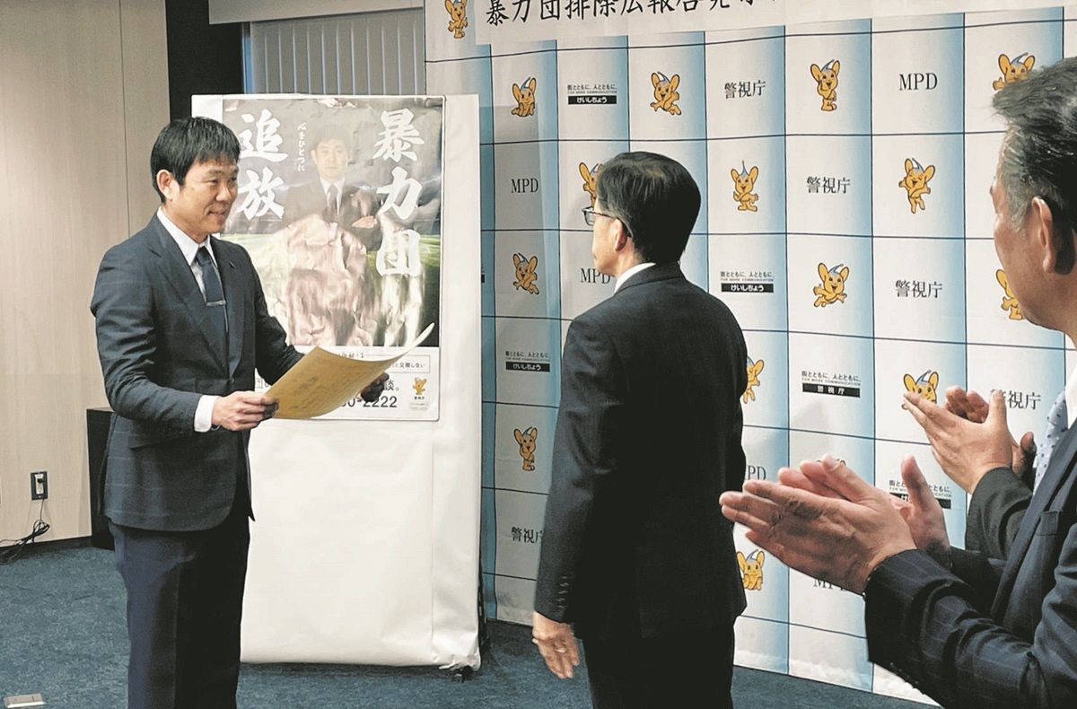 サッカー日本代表の森保一監督が8日、暴力団を追い出す広報活動に大きく貢献したとして、警視庁から感謝状を受け取った。
