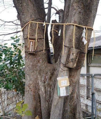 太田姫稲荷にゆかりのあるムクの木。昭和6年(1931年)にJR御茶ノ水駅総武線拡張の際に駿河台に遷座したため、この場所に置かれているという。