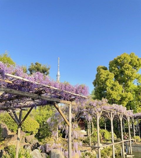 江戸から変わらぬ亀戸天神の藤がスカイツリーを背景に咲き誇る