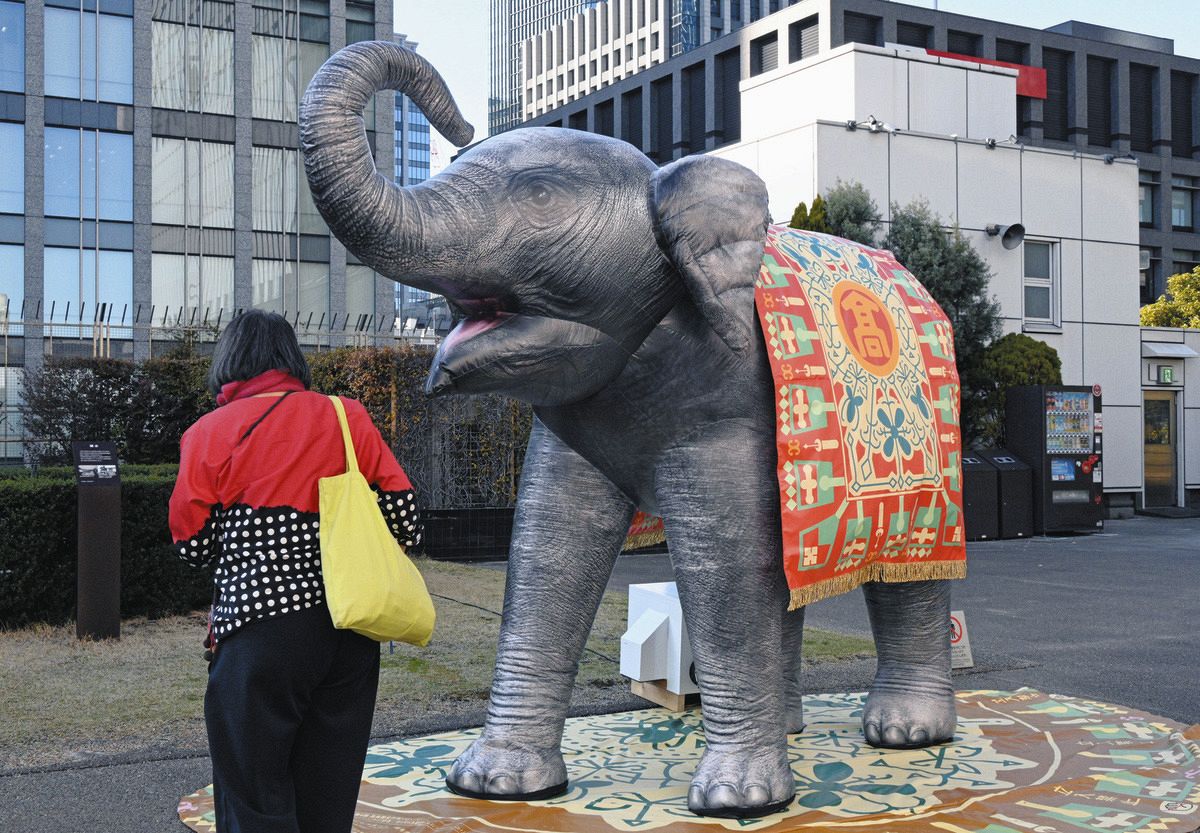 さくら通り側の入り口で、子ゾウのタカちゃんが迎えてくれる。1950(昭和25)年にタイからやって来た時の姿をバルーンで再現。