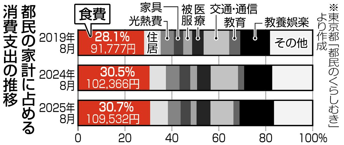 <深掘りこの数字> 都民の家計状況を集計した都の統計「都民のくらしむき」によると、2025年8月の1世帯あたりの消費支出は35万637...